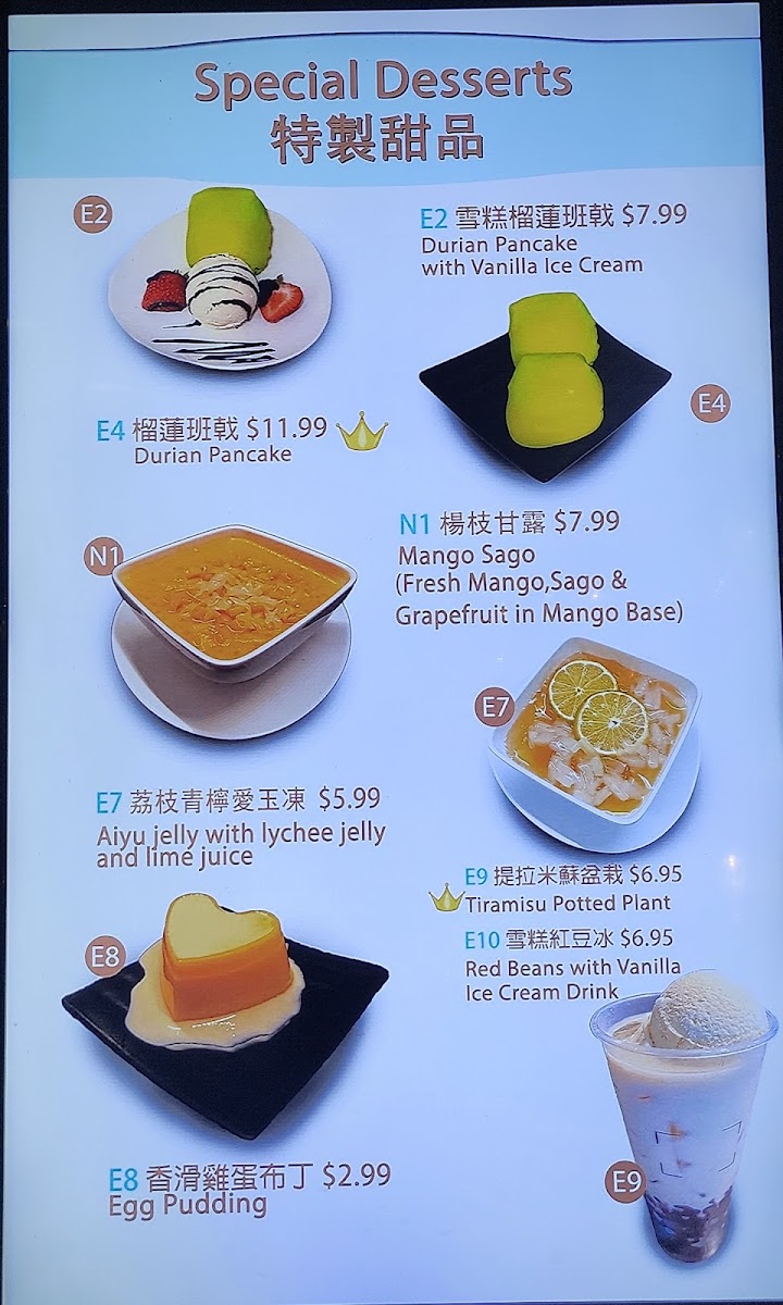 Desserts: The dessert section highlights shaved ice varieties like small Mango and Strawberry Bingsoo, as well as specialty egg waffles including Nutella Egg Waffle and Peanut Butter Condensed Milk Egg Waffle. Other dessert options include matcha mille crepes, tiramisu potted plant, and durian pancakes served with or without ice cream. Traditional sweet dishes such as black glutinous rice with coconut milk and mixed fruit with sago are also available.